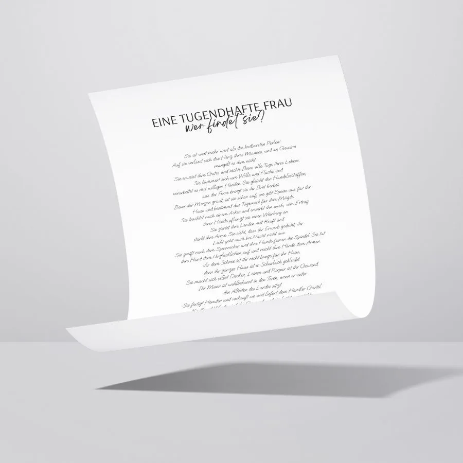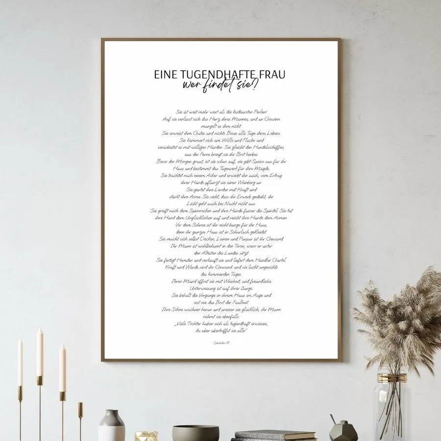 Bringe zeitlose Inspiration an deine Wand – mit diesem stilvollen Poster “Eine tugendhafte Frau” aus der Bibel – Sprüche 31. Der bedeutungsvolle Vers erinnert an Stärke, Würde und Weisheit einer gottgefälligen Frau – ein besonderes Statement für dein Zuhause, dein Büro oder als Geschenk für Frauen des Glaubens.